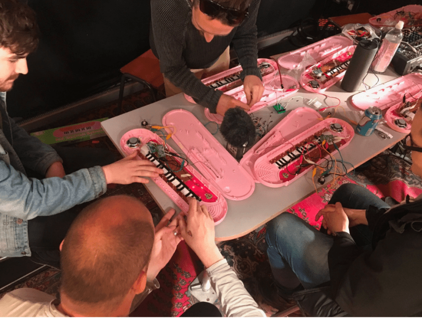 Week 2: Circuit bending toy piano keyboards to create unexpected results.