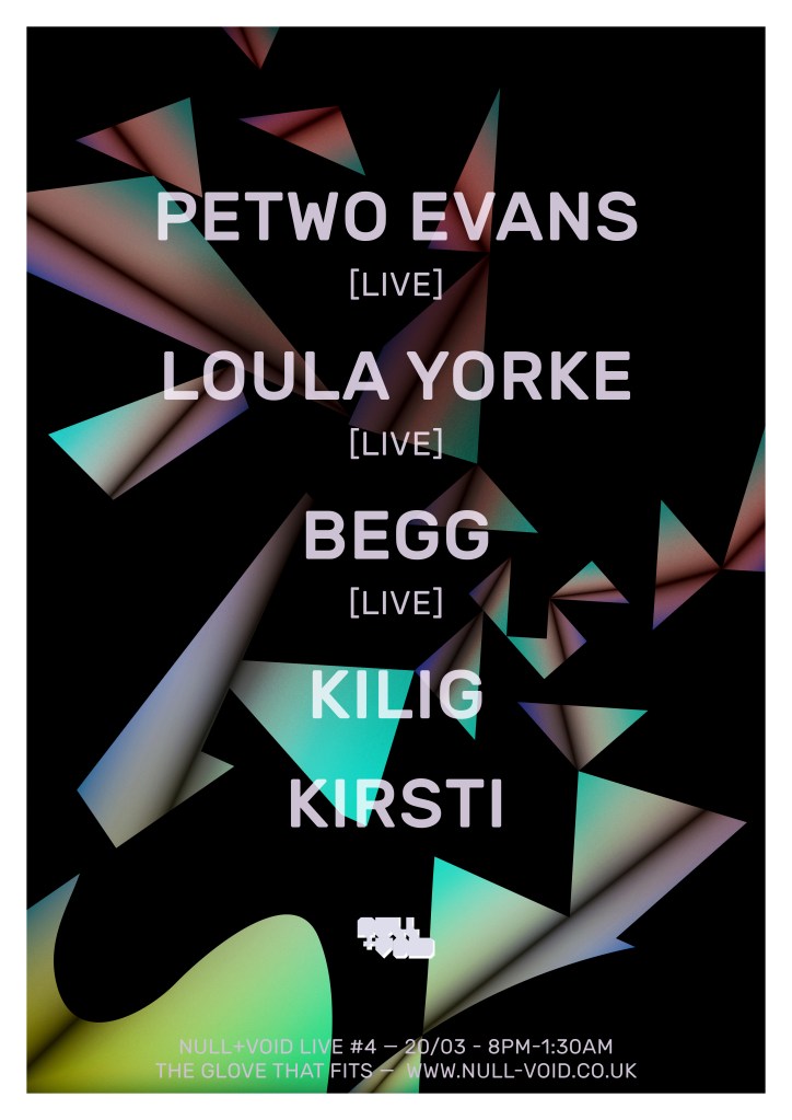 I’m super excited to have been invited to play a [null+void] LIVE event in Dalston on 20 March 2020. [null+void] is a record label and club night run by the inimitable Kirsti that only goes from strength to strength. And the LIVE editions are just that: focusing on artists pusing the boundaries and bringing a live element to their sets. The line-up for 20 March is a cracker! Headlining are Welsh Futurists, Petwo Evans: sound system-primed, innovative club tracks making use of found percussion objects and consumer DJ equipment – which I am really hyped about getting my ears round tbh. As well as sets from Begg, Killig, and Kirsti herself of course! See you at The Glove That Fits.