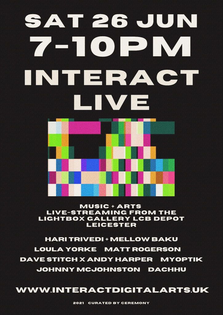 Interact Digital Arts says: “Interact Live is back! After a year and a half without any live events, we have teamed up with Ceremony to put on a night of live music and visuals to mark the closing of the 8-bit Exhibition. Due to continuing COVID-19 restrictions, the event is invite-only but will be streamed publically on YouTube.”