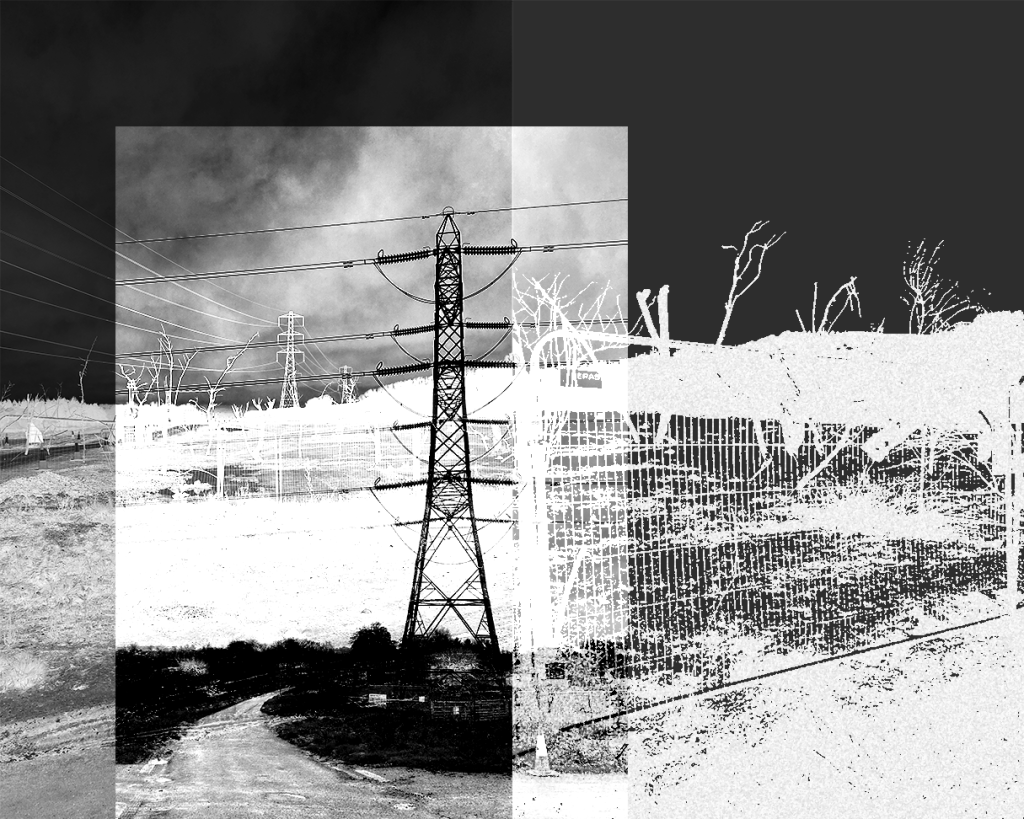 00:24 The sounds of pylons fizzing in the pissing rain up near the Roundway White Horse last November. My planned route back from the local chalky cheval was blocked by some major electrical works in the valley, closing off the return loop of the footpath back to town without warning. I photographed these forlorn decapitated branches cable-tied to the Heras. Do these unsettling symbols mark the places where the hedgerows were so they remain in memory to be regenerated? Do they stop the birds flying into the fencing? If anyone who works on these types of construction projects and can shed any light, I’m all ears.