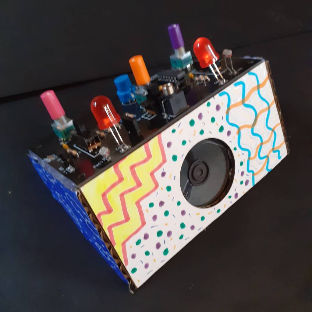 Analogue synthesiser designed for DIY synth-build workshops and improvised performance. Light-reactive pitch and pulse width control. Hand-held, battery-powered. Internal speaker, line out. Customisable cardboard enclosures. With thanks to Dr Tom Richards for help with circuit design and creating the gerber files, and to Frazer Merrick for laser cutting the cardboard.