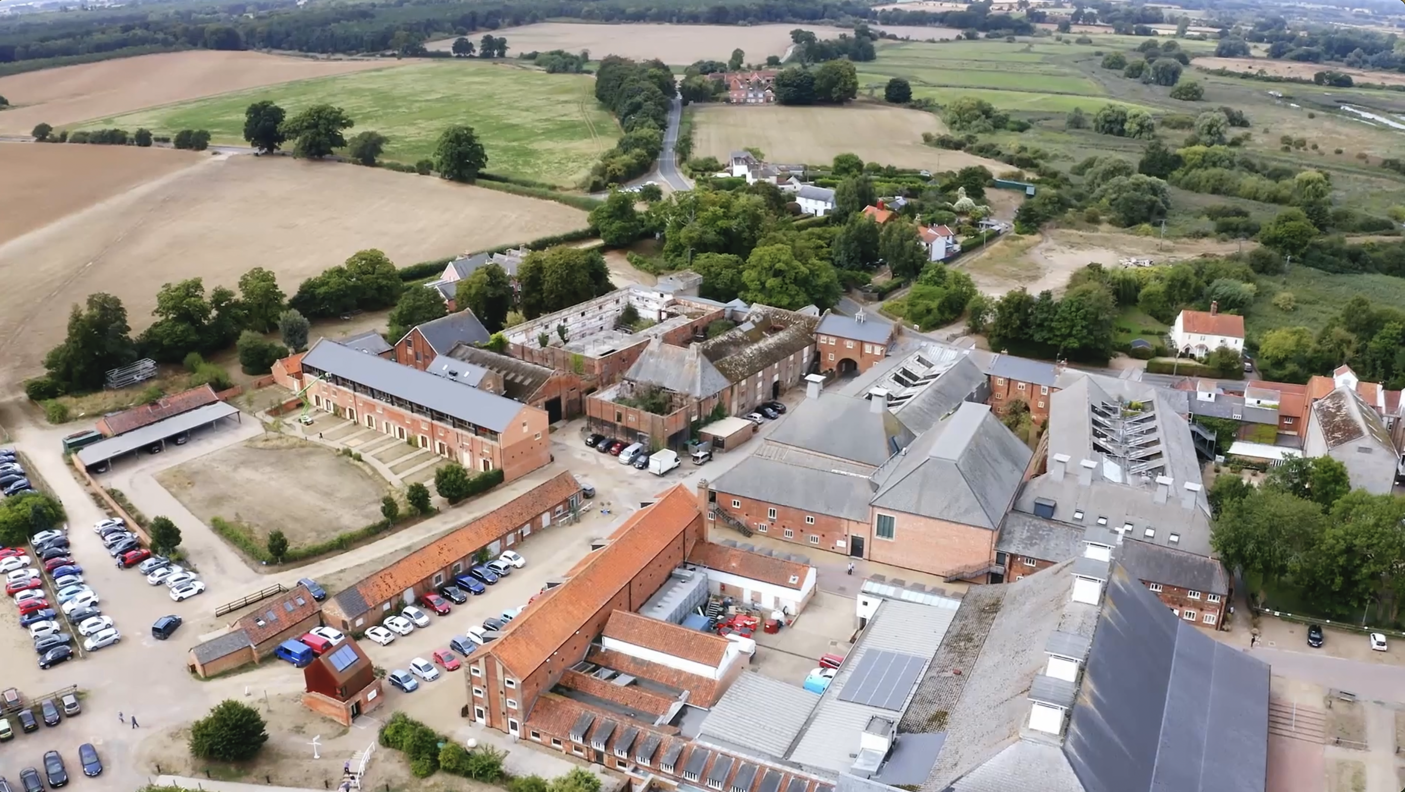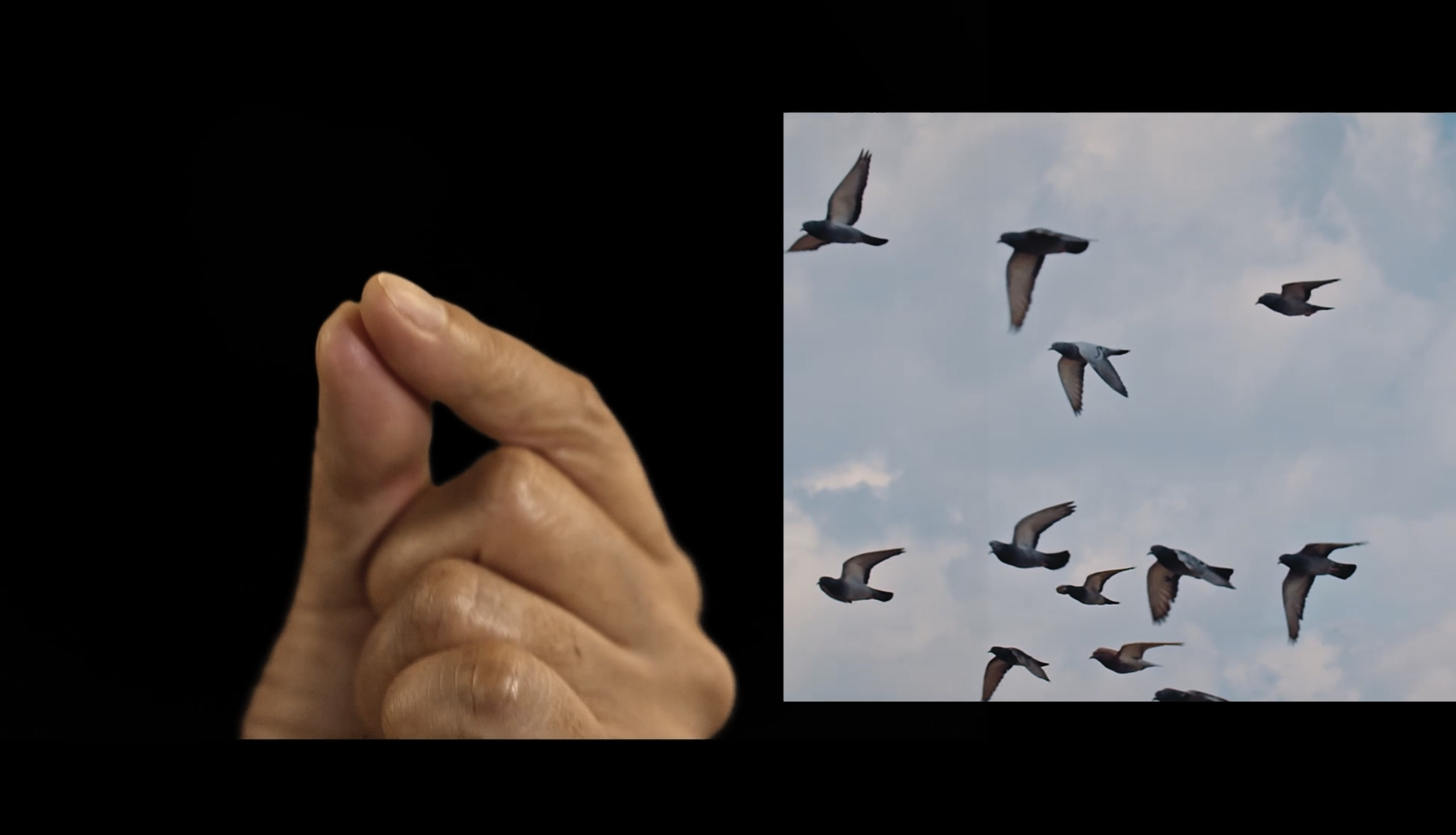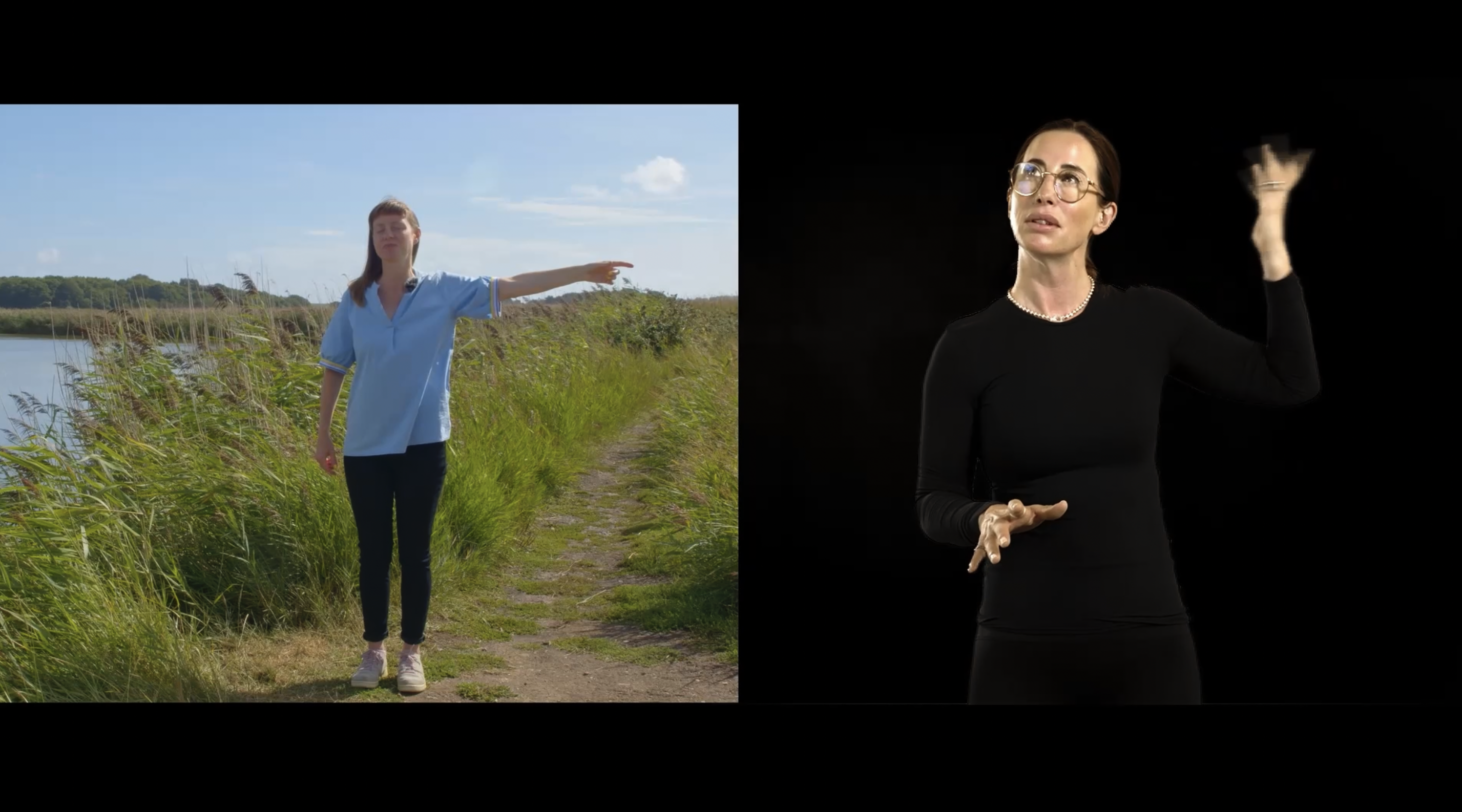 stills from the film, showing: Chisato Minamimura filmed from above by a drone opening her hands; visual vernacular of fingers snapping open and closed, birds in flight; Loula Yorke pointing to the location of a sound, BSL interpreter Rose translating Loula’s spoken words; an aerial view of Snape Maltings site.